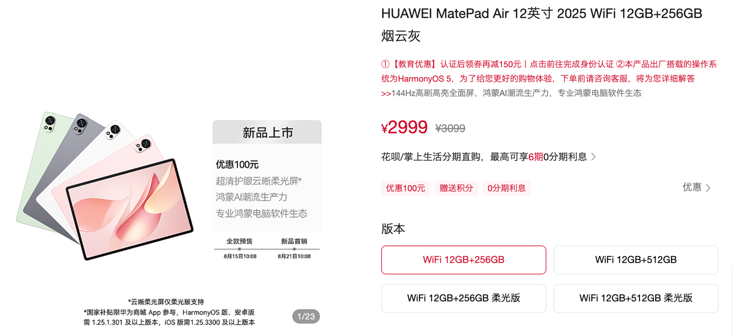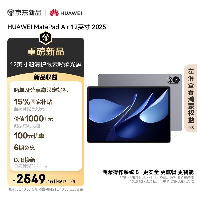 目前,华为 MatePad Air 2025 款新品已经正式开启预售,售价 2999 元起,国补后 2549 元起,将于 8 月 21 日 10:08 正式开售。