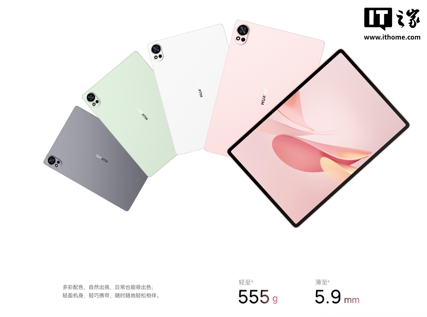 设计方面,华为 MatePad Air 2025 款创新幻彩珠光电泳工艺打造出带马卡龙奶油质感的机身,恍若星光点缀,提供草木绿、樱语粉、羽砂白、烟云灰四色。555g 重量搭配 5.9mm 超薄全金属一体化机身,握持轻盈舒适。