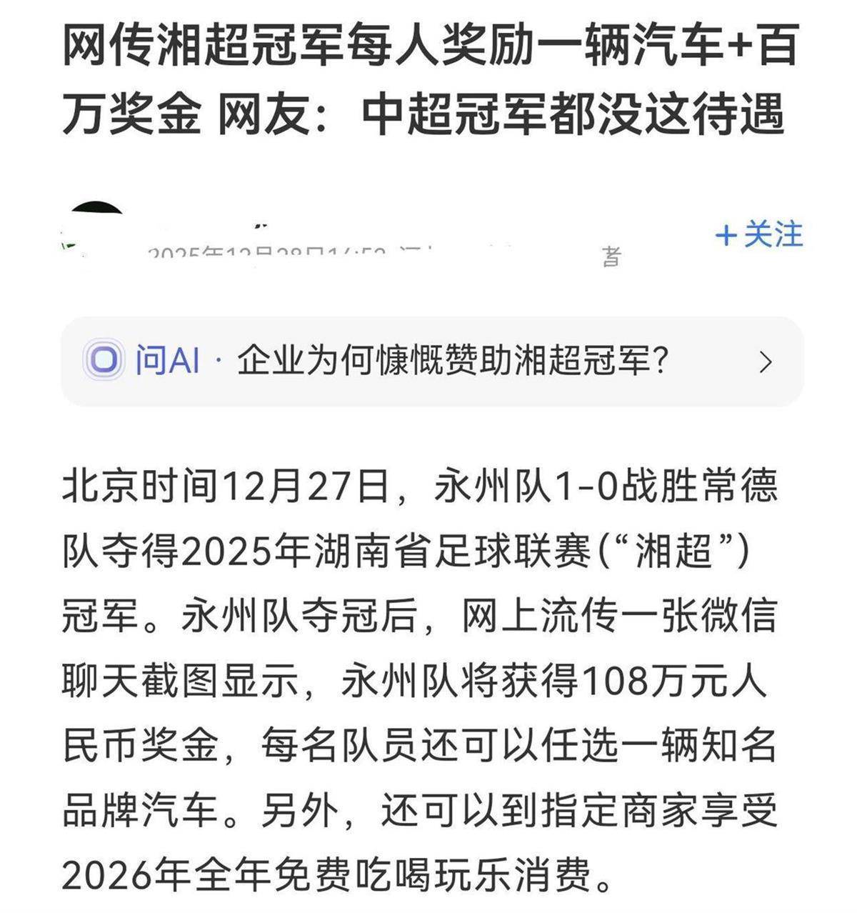 近日,网上有消息称,12月27日晚,永州队1比0战胜常德队夺得2025年湘超冠军,永州队将获得108万元奖金,每名队员还可以任选一辆知名品牌汽车。另外,还可以到指定商家享受2026年全年免费吃喝玩乐消费。