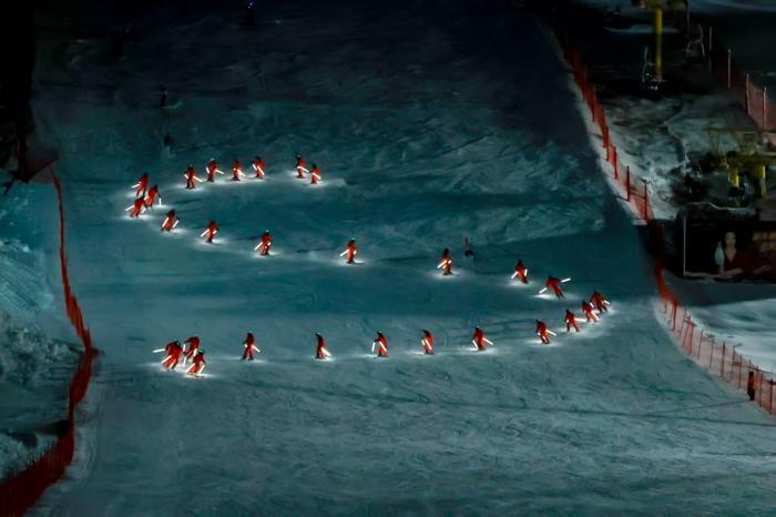 雪道上,专业滑雪教练手持荧光雪杖、脚踏荧光雪板,从雪道之巅御风疾驰。流动的荧光轨迹如银河流星划破雪夜长空,勾勒出一幅鲜活灵动的流动视觉画卷。